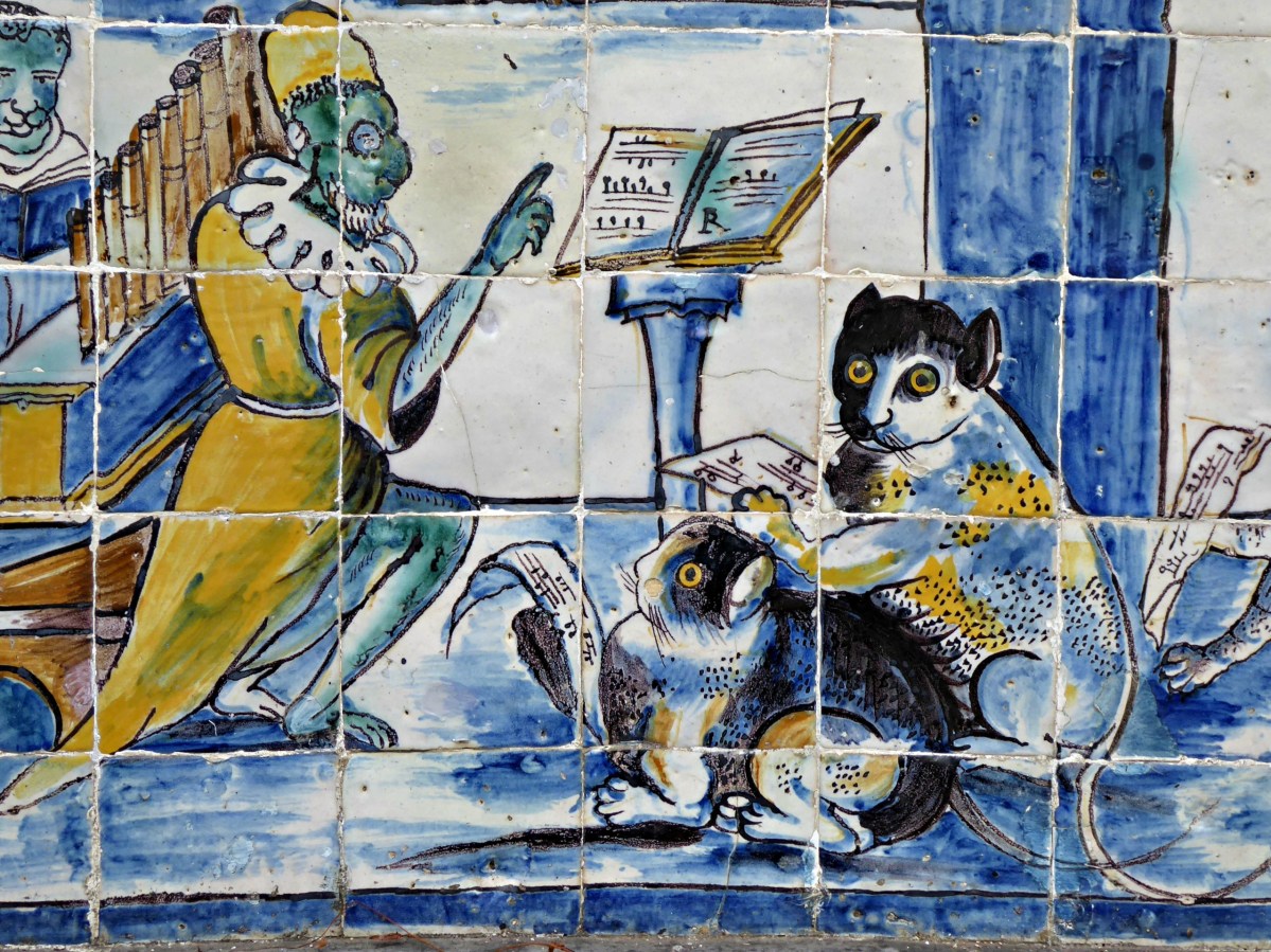 On the tiles, in a fun tone, the teacher, accompanied by a group of musicians with a positive organ, practices singing exercises with his feline students. On the other side, the barber cuts the whiskers of a cat, while the surgeon treats the injured foot of another one. To underline the ironic intentions of the representation, the painter added two inscriptions in Portuguese: “I’m the teacher of solfeggio” and “Approved surgeon”.
