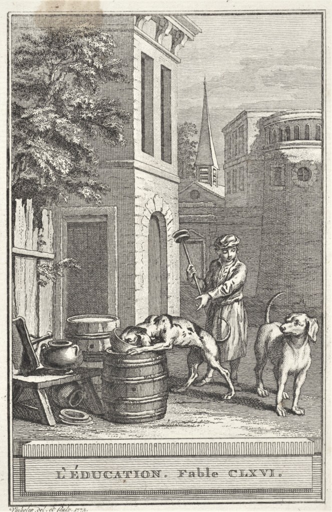 The importance of education was also the central theme of one of the fables collected in the eighth book, first published in 1678. It tells the story of two dogs born from the same litter, but with very different sorts. The first, named Caesar, was handed over to a great hunter, and became, as the name implies, the chief progenitor of his race. The second, entrusted to a cook, became a despicable gluttonous thief.