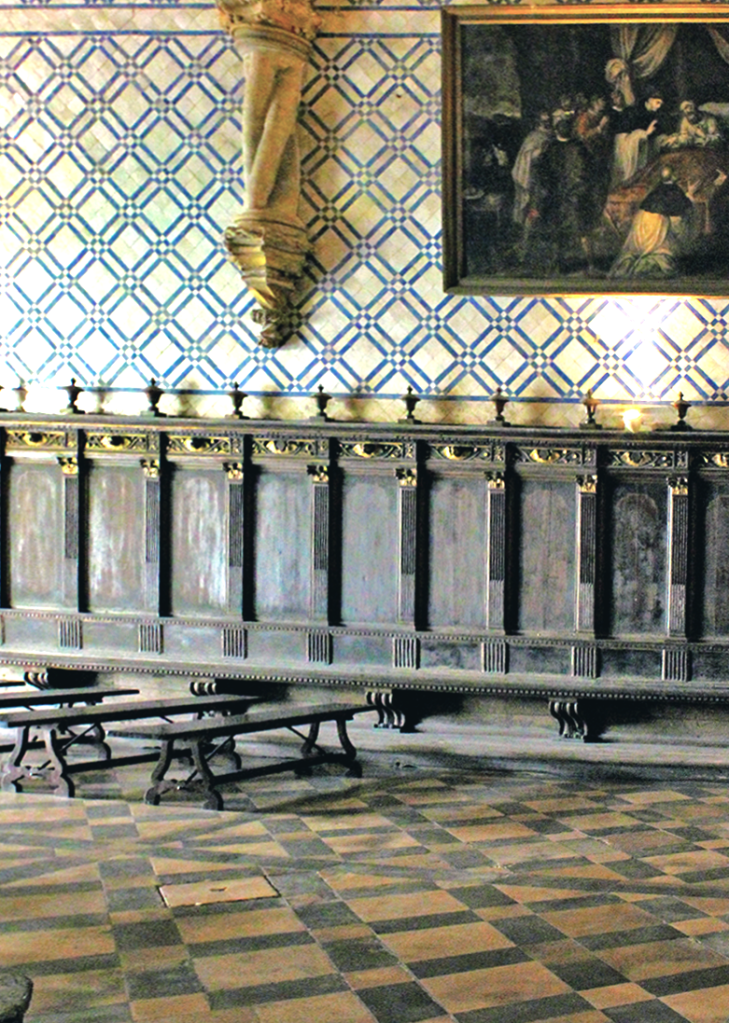 In Coimbra, the sacristy of the Mosteiro de Santa Cruz boasts one of the most beautiful decorative programs from the first decades of the 17th century. Nothing was left to chance: the barrel vault was decorated with octagons and rhombuses ornaments in bold relief; the walls were tiled with various sizes of polychrome patterns, and the floor with a mesh of black and white marble tiles.