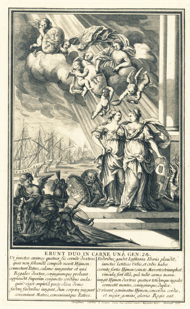 Marriages were an essential part of the political and social contract to create a peaceful environment. In 1728, to limit the growing conflicts caused by the dispute over the possession of territories in South America, Spanish diplomacy proposed the realization of a double alliance: in addition to the marriage between the Spanish crown prince and Maria Bárbara, the Portuguese prince should marry Princess Mariana Vitória. The first ceremony took place in a wooden palace over the bridge in the Caia River, built for the occasion, with several pavilions on both banks. Among the numerous accounts and engravings that celebrate the double matrimony, the print engraved by François Harrewijn stands out, with the female personification of the two Iberian crowns in an affectionate embrace. In the foreground, the figure of a cupid chaining the god Mars symbolizes the victory of peace and concord.