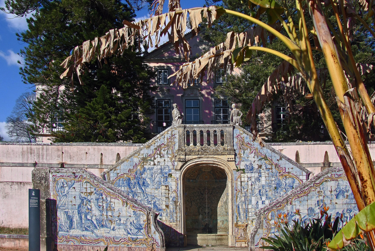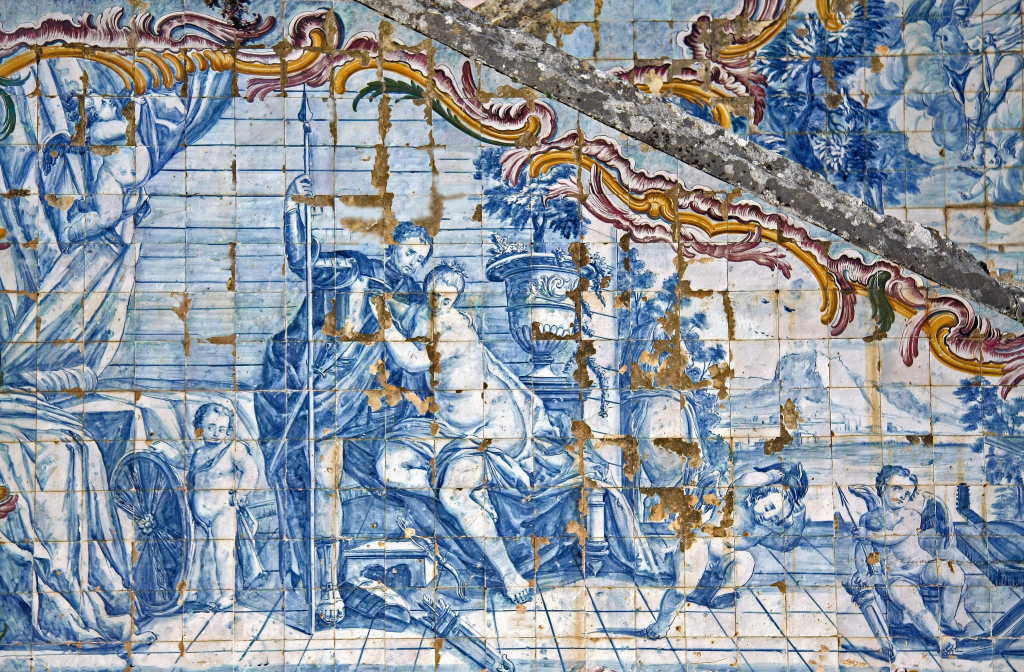 At the Quinta de Oeiras, on the stairs that flank the fountain’s niche, two tile panels depict the victories of love over war: Mars disarmed by Venus and Andromeda freed by Perseus.