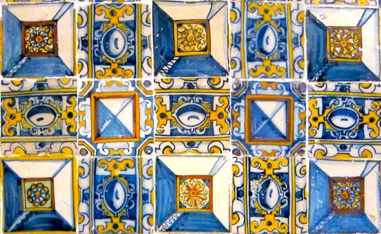 The use of the diamond pattern was not limited to the application on the façades of noble houses, and, in the last decades of the 16th century, it gained prominence again through the transference to tiles, this time for the interior decoration of religious areas. According to the historian Santos Simões, the pattern of “clavos” would have been first made in the potteries of Talavera, then later produced in Seville, from where it was imported for the decoration of the Jesuit church of São Roque, in Lisbon, in 1596.